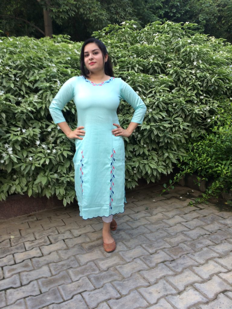 PRODUCT DESCRIPTION Blue cotton cutwork silk thread embroidered kurti with three quarter sleeves MATERIAL Cotton WASHING INSTRUCTIONS: HAND...
