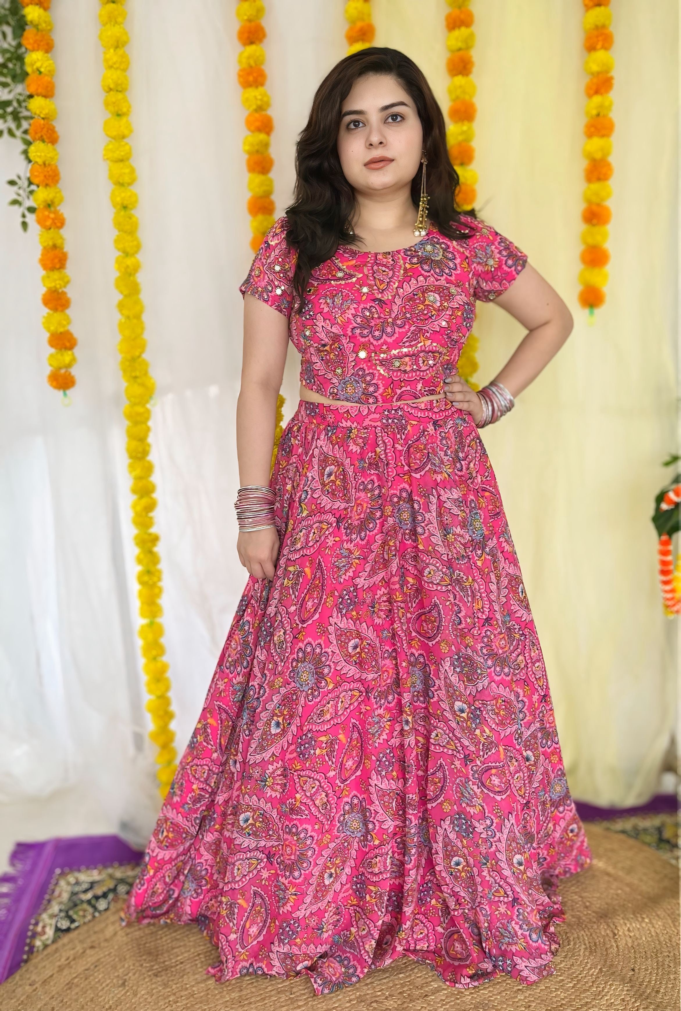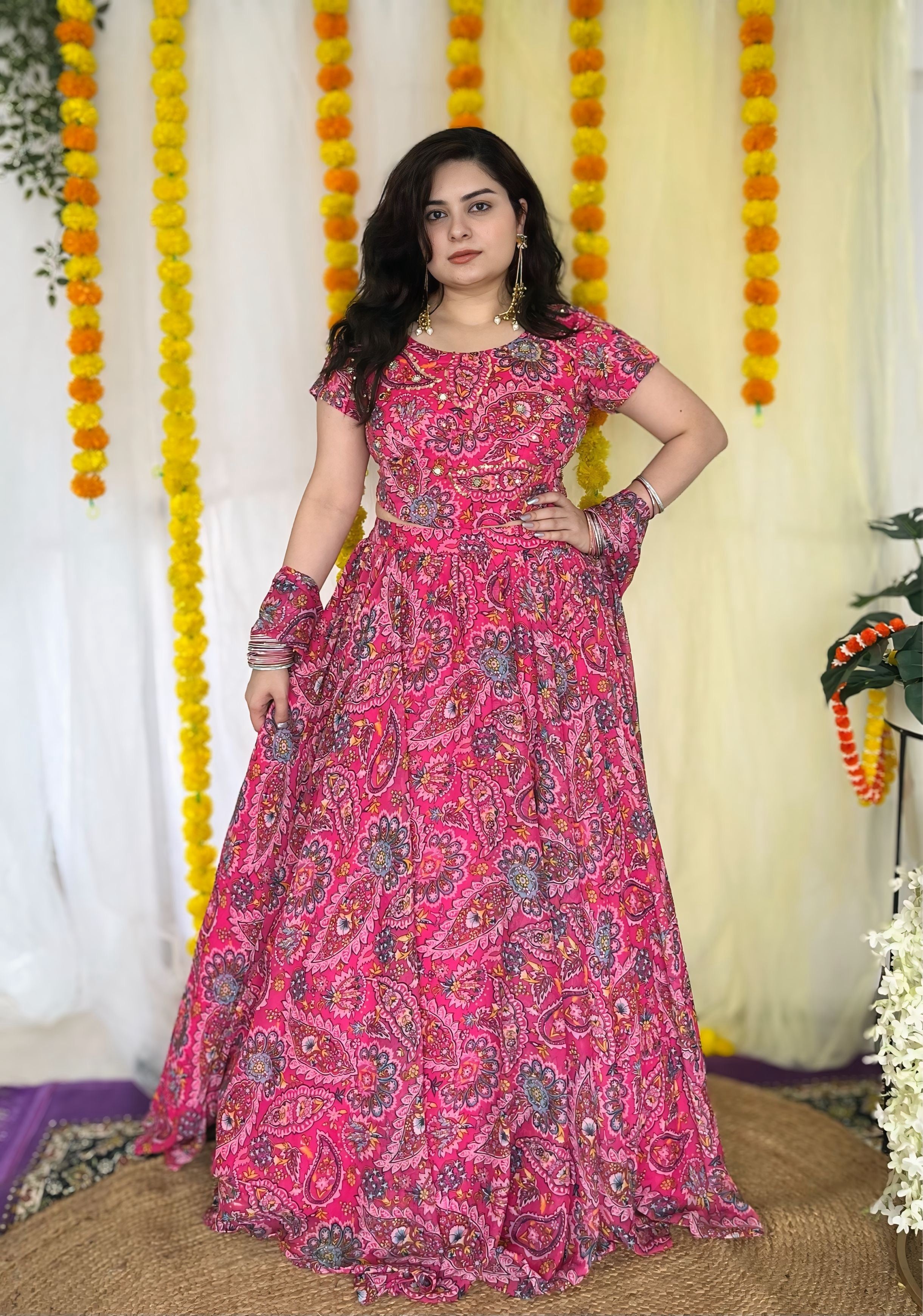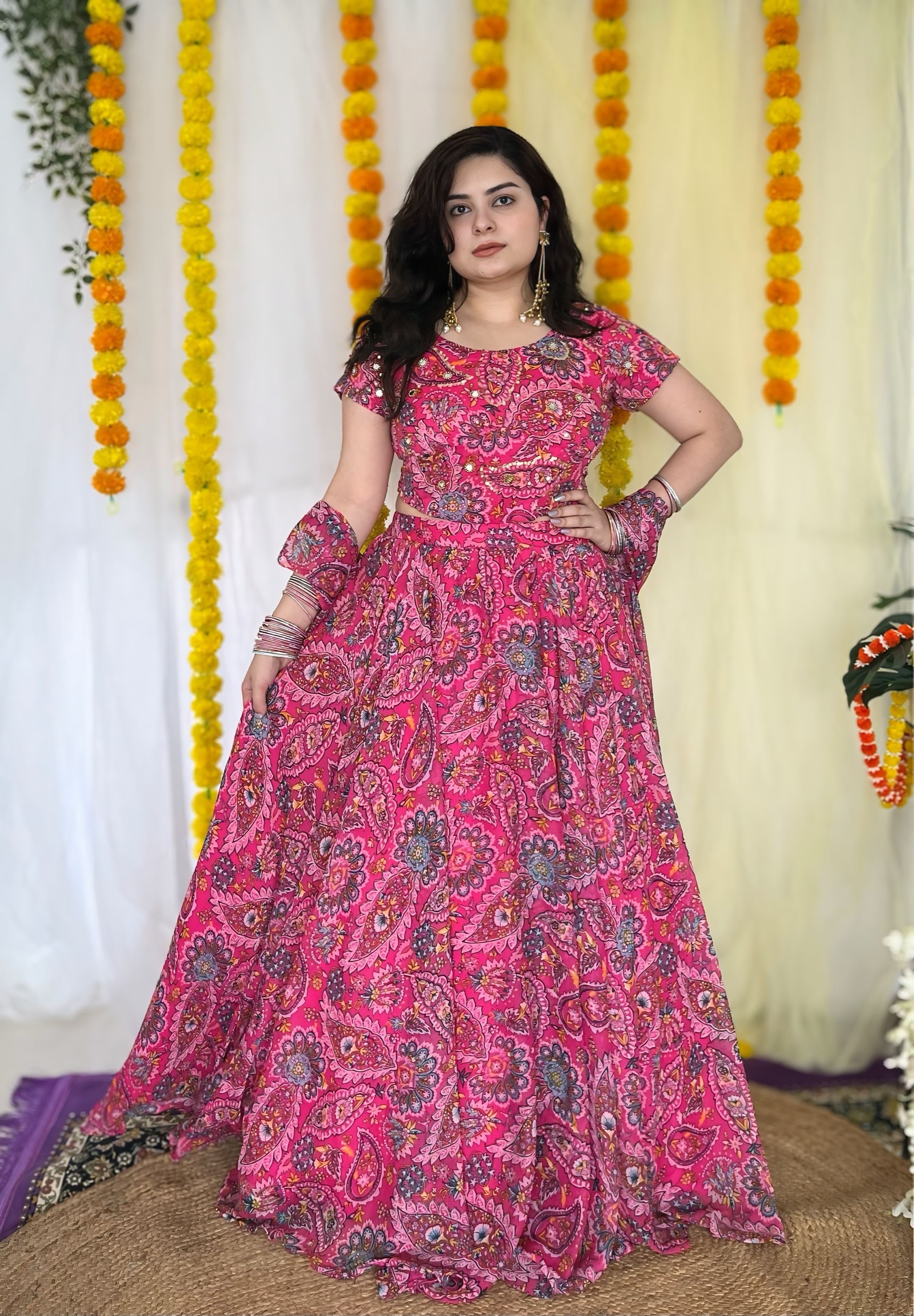 Turn heads this festive season with our Hand Embroidered Pink Chiffon Lehenga Set. Crafted for elegance, this designer ensemble features a chic corset blouse adorned with intricate hand embroidery and delicate detailing. The heavy flare lehenga adds drama and grace, making it a showstopper for Diwali parties, wedding functions, and festive celebrations. The soft chiffon fabric ensures comfort without compromising on glam. Pair it with statement jewelry for a picture-perfect look. A must-have for your ethnic wardrobe, this trending outfit blends traditional craftsmanship with modern style. Limited stock – shop now and shine bright this festive season!