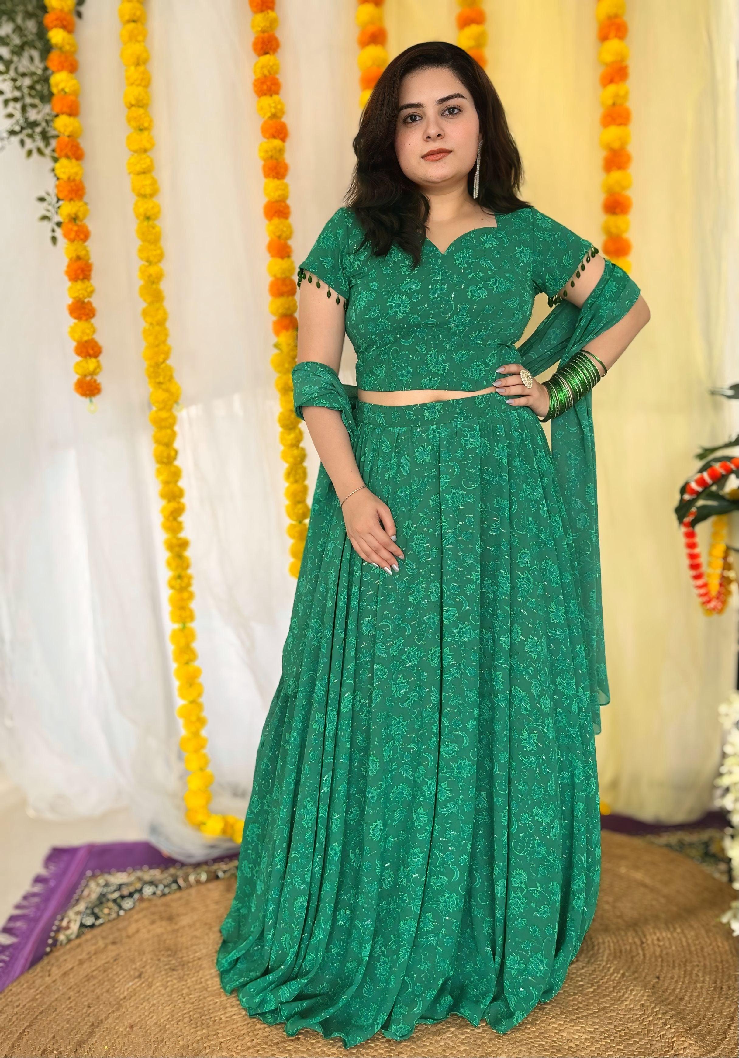 Turn heads this festive season with our dobby printed peacock green georgette lehenga set. Featuring a heavy flare, detailed sleeves, and a stunning corset blouse, it's perfect for mehndi, Diwali, or wedding celebrations. Effortlessly elegant, this ensemble blends traditional charm with modern flair for an unforgettable look.