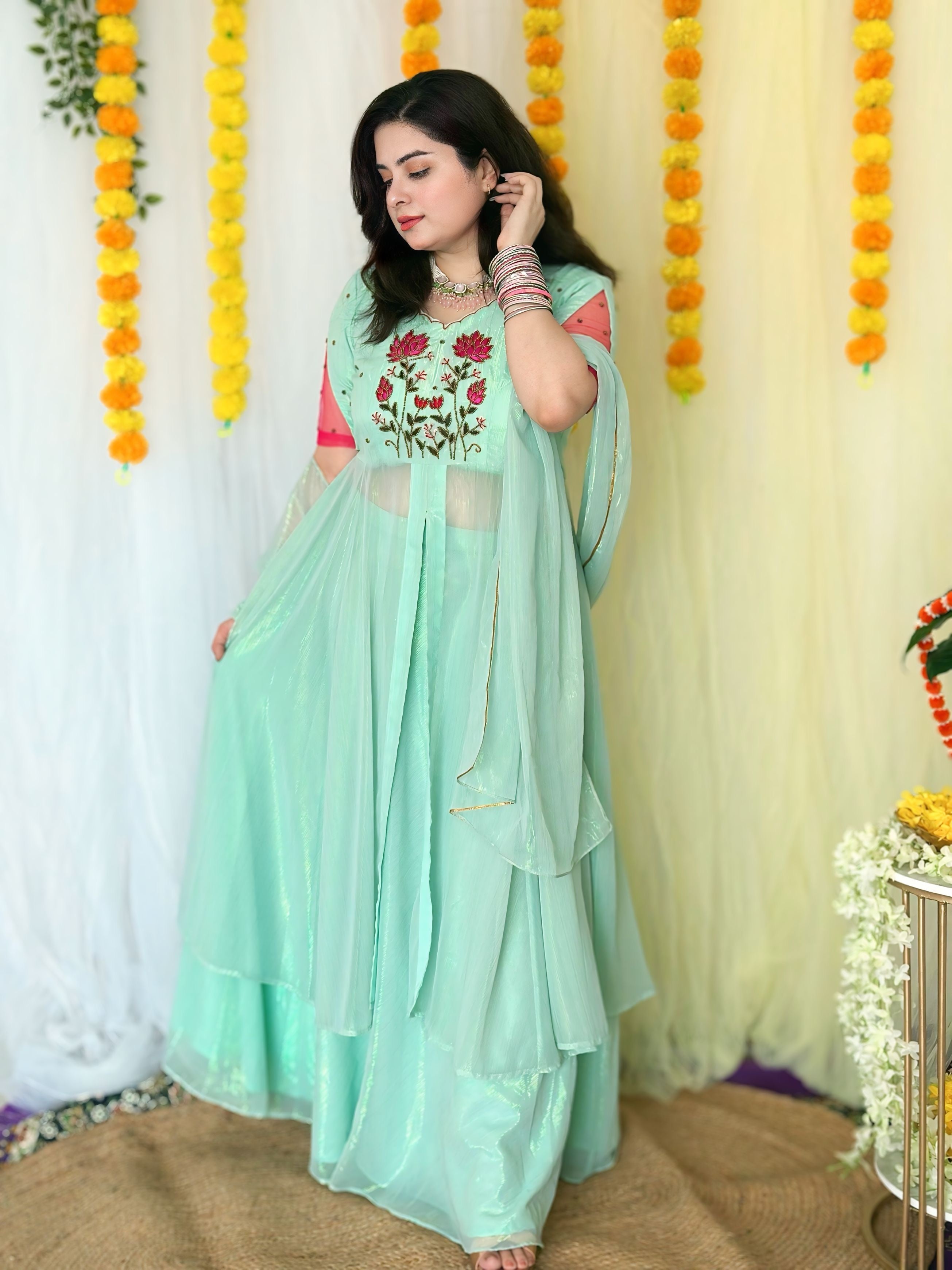 Turn heads this festive season with our luxurious sea green georgette skirt set, beautifully crafted with intricate hand embroidery and elegant lotus motifs. This designer ethnic ensemble is the perfect blend of traditional charm and modern sophistication, making it your go-to outfit for Diwali parties, mehendi functions, sangeet ceremonies, and special occasions.